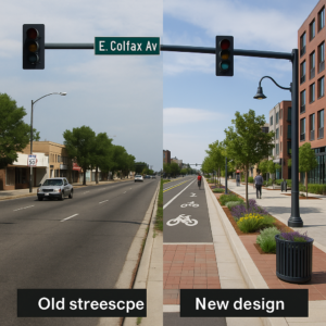Provide an update on the streetscape project, including completed work, upcoming phases, and how the improvements (like wider sidewalks, bike...